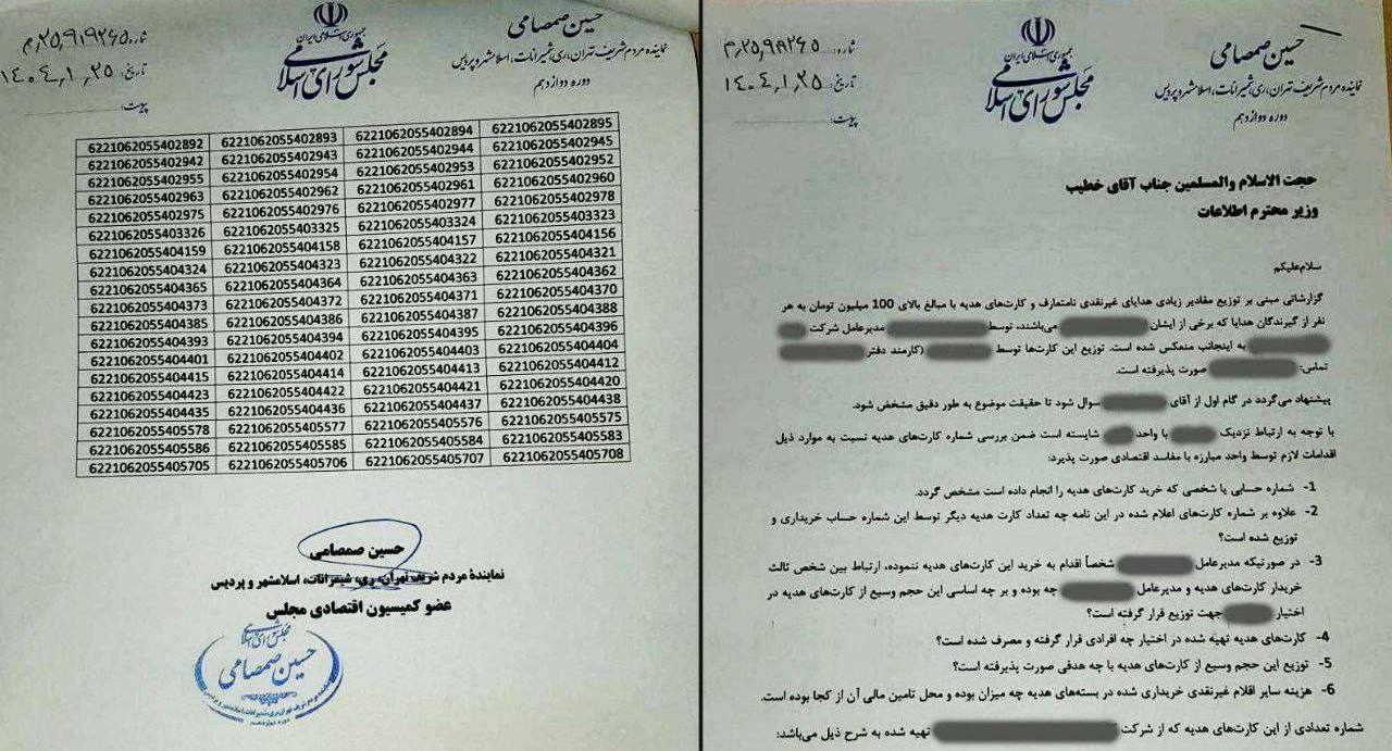 ⏺گزارشی مبنی بر پرداخت حدود ۲۸۰۰ کارت هدیه (۱۴ میلیارد تومان) به برخی مسئولین ارائه شده است.