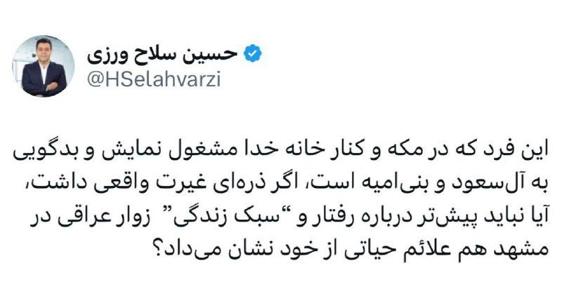 این فرد که در مکه و کنار خانه خدا مشغول نمایش و بدگویی به آلسعود و بنیامیه است، اگر ذرهای غیرت واقعی داشت، آیا نباید پیشتر درباره رفتار و “سبک زندگی” زوار عراقی در مشهد هم علائم حیاتی از خود نشان می داد؟