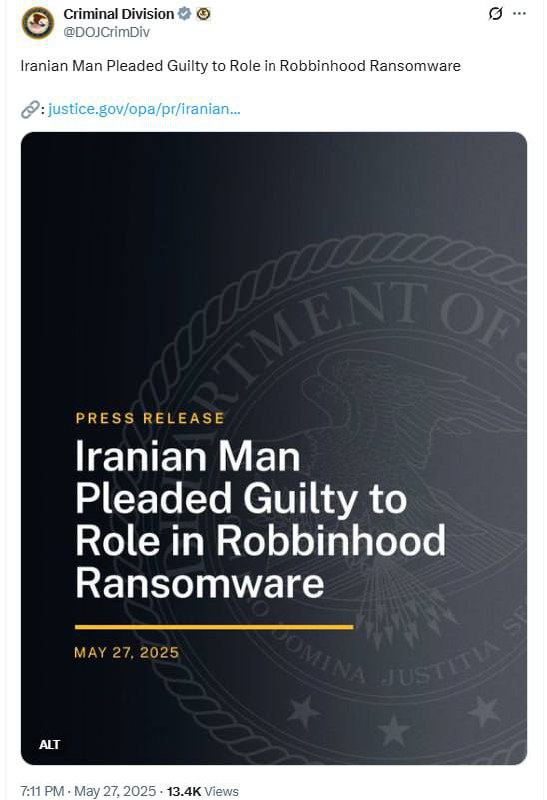 وزارت دادگستری آمریکا اعلام کرد؛ «سینا قلینژاد» ۳۷ ساله به حمله سایبری سال ۲۰۱۹ به بالتیمور در مریلند و سایر حملات مشابه اعتراف کرده است.