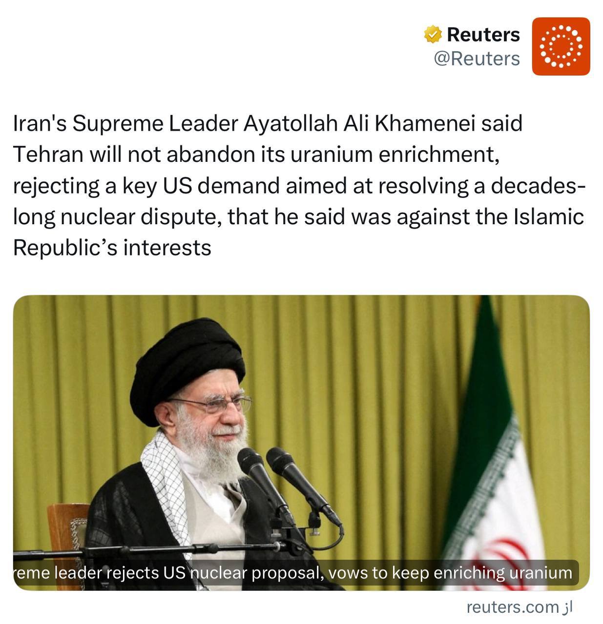 رهبر ایران، آیتالله سید علی خامنهای، اعلام کرد که تهران غنیسازی اورانیوم را کنار نخواهد گذاشت و درخواست هستهای ایالات متحده را خلاف منافع جمهوری اسلامی خوانده و رد کرد. دیدگاهتان را بنویسید لغو پاسخدیدگاهبرای ارسال دیدگاه نام یا نامکاربری خود را وارد کنید برای ارسال دیدگاه آدرس ایمیل خود را وارد کنید آدرس وبسایت خود را وارد کنید (اختیاری) ذخیره نام، ایمیل و وبسایت من در مرورگر برای زمانی که دوباره دیدگاهی مینویسم. Δ