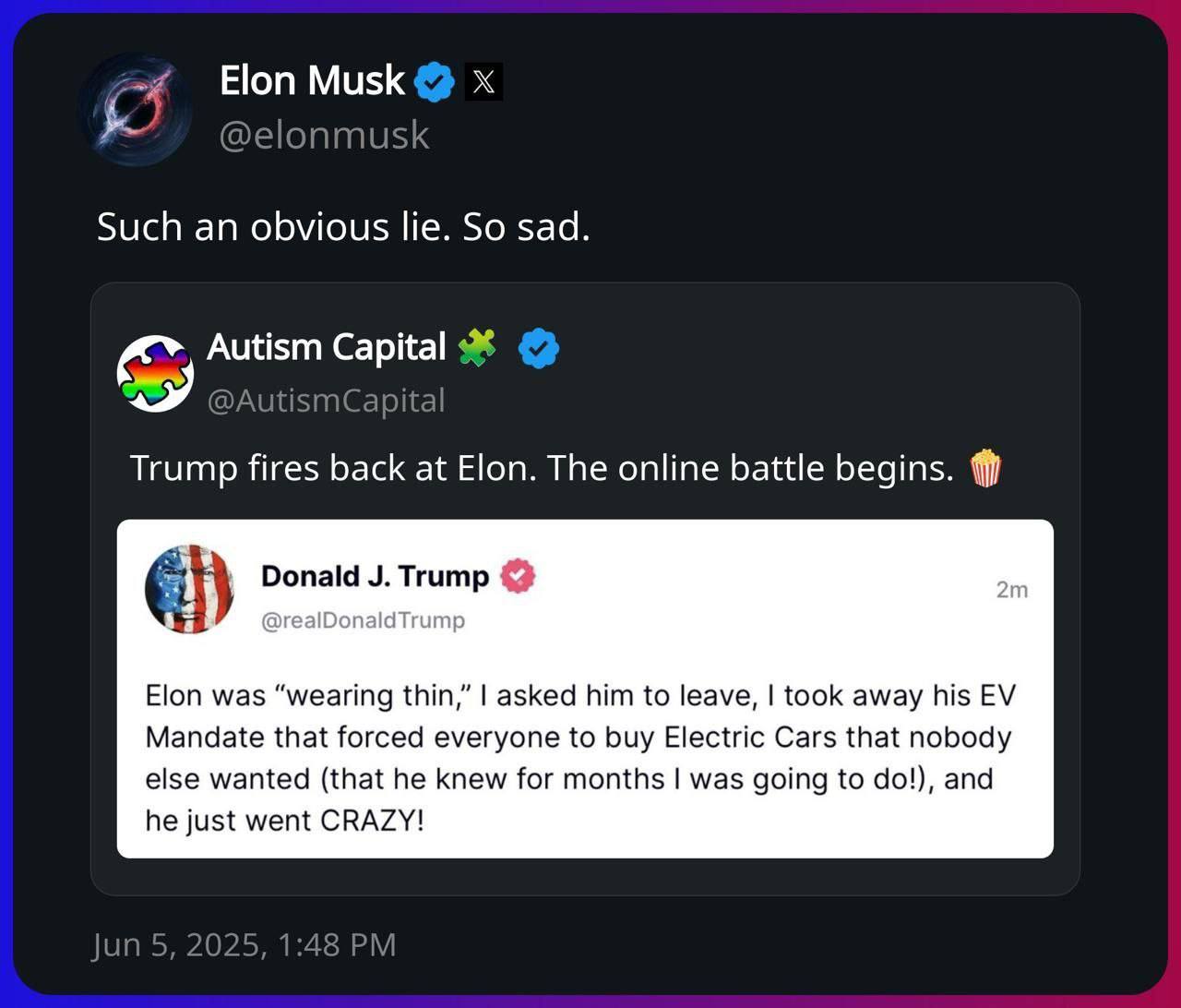 ایلان ماسک در پاسخ به ترامپ که گفته بود هیچ‌کس ماشین‌هایش را نمی‌خرد: چه دروغ آشکاری. خیلی غم‌انگیز است.