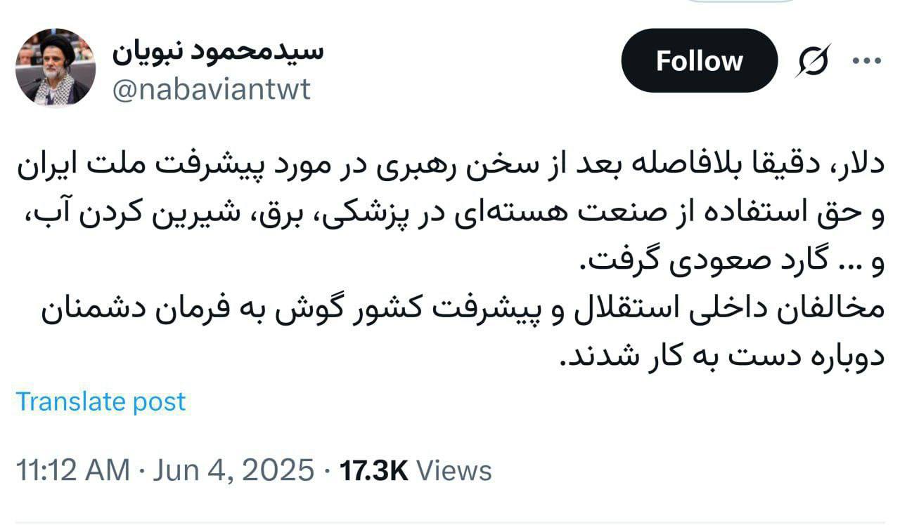 دلار، دقیقا بلافاصله بعد از سخن رهبری در مورد حق استفاده از صنعت هستهای گارد صعودی گرفت!!! دیدگاهتان را بنویسید لغو پاسخدیدگاهبرای ارسال دیدگاه نام یا نامکاربری خود را وارد کنید برای ارسال دیدگاه آدرس ایمیل خود را وارد کنید آدرس وبسایت خود را وارد کنید (اختیاری) ذخیره نام، ایمیل و وبسایت من در مرورگر برای زمانی که دوباره دیدگاهی مینویسم. Δ