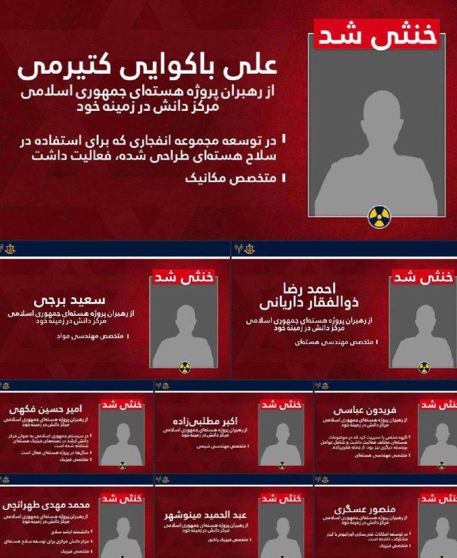 در جریان حملات گسترده نیروی هوایی ارتش اسرائیل با آغاز عملیات «طلوع شیران»، ۹ تن از دانشمندان و متخصصان ارشد جمهوری اسلامی که نقش کلیدی در پیشبرد برنامه تسلیحات هستهای این رژیم داشتند، به هلاکت رسیدند.