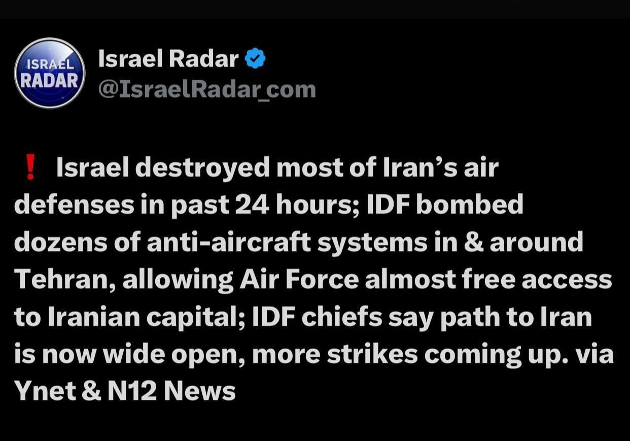 🛑اسرائیل در ۲۴ ساعت گذشته بیشتر پدافند هوایی ایران را نابود کرد؛ ارتش اسرائیل دهها سامانه ضدهوایی را در داخل و اطراف تهران بمباران کرد و به نیروی هوایی اجازه دسترسی تقریباً آزاد به پایتخت ایران را داد؛ فرماندهان ارتش اسرائیل میگویند مسیر حمله به ایران اکنون کاملاً باز است و حملات بیشتری در راه است.