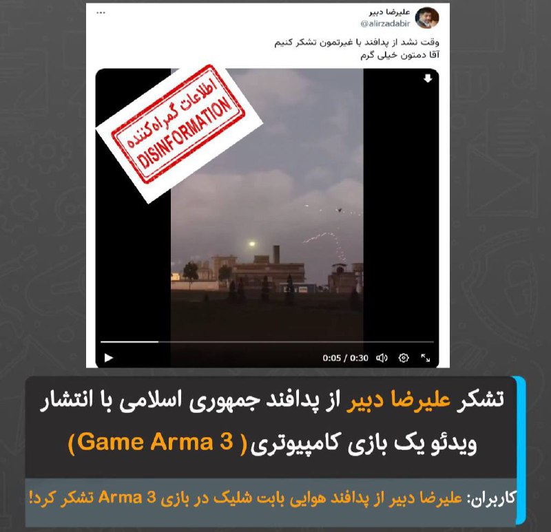 ویدئویی از یک بازی کامپیوتری به نام Game Arma 3 توسط علیرضا دبیر و بسیاری از کاربران ارزشی و حامی جمهوری اسلامی در حال دست به دست شدن است که ادعا میکنند پدافند جمهوری اسلامی یک جنگنده F35 ارتش اسرائیل را منهدم کرده است.