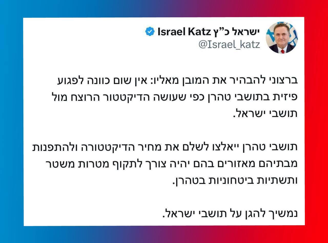یسرائل کاتس، وزیر امور خارجه اسرائیل، در پی تشدید حملات به اهداف نظامی جمهوری اسلامی، با انتشار پیامی صریح اعلام کرد که: