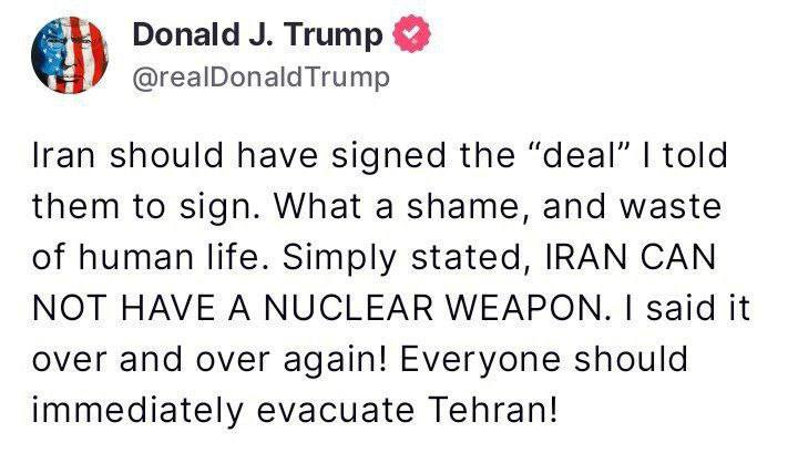 ایران باید «توافقی» را که من به آنها گفتم امضا میکرد. چه شرمآور و اتلاف جان انسانها. به زبان ساده، ایران نمیتواند سلاح هستهای داشته باشد. من بارها و بارها این را گفتهام! همه باید فوراً تهران را تخلیه کنند! دیدگاهتان را بنویسید لغو پاسخدیدگاهبرای ارسال دیدگاه نام یا نامکاربری خود را وارد کنید برای ارسال دیدگاه آدرس ایمیل خود را وارد کنید آدرس وبسایت خود را وارد کنید (اختیاری) ذخیره نام، ایمیل و وبسایت من در مرورگر برای زمانی که دوباره دیدگاهی مینویسم. Δ