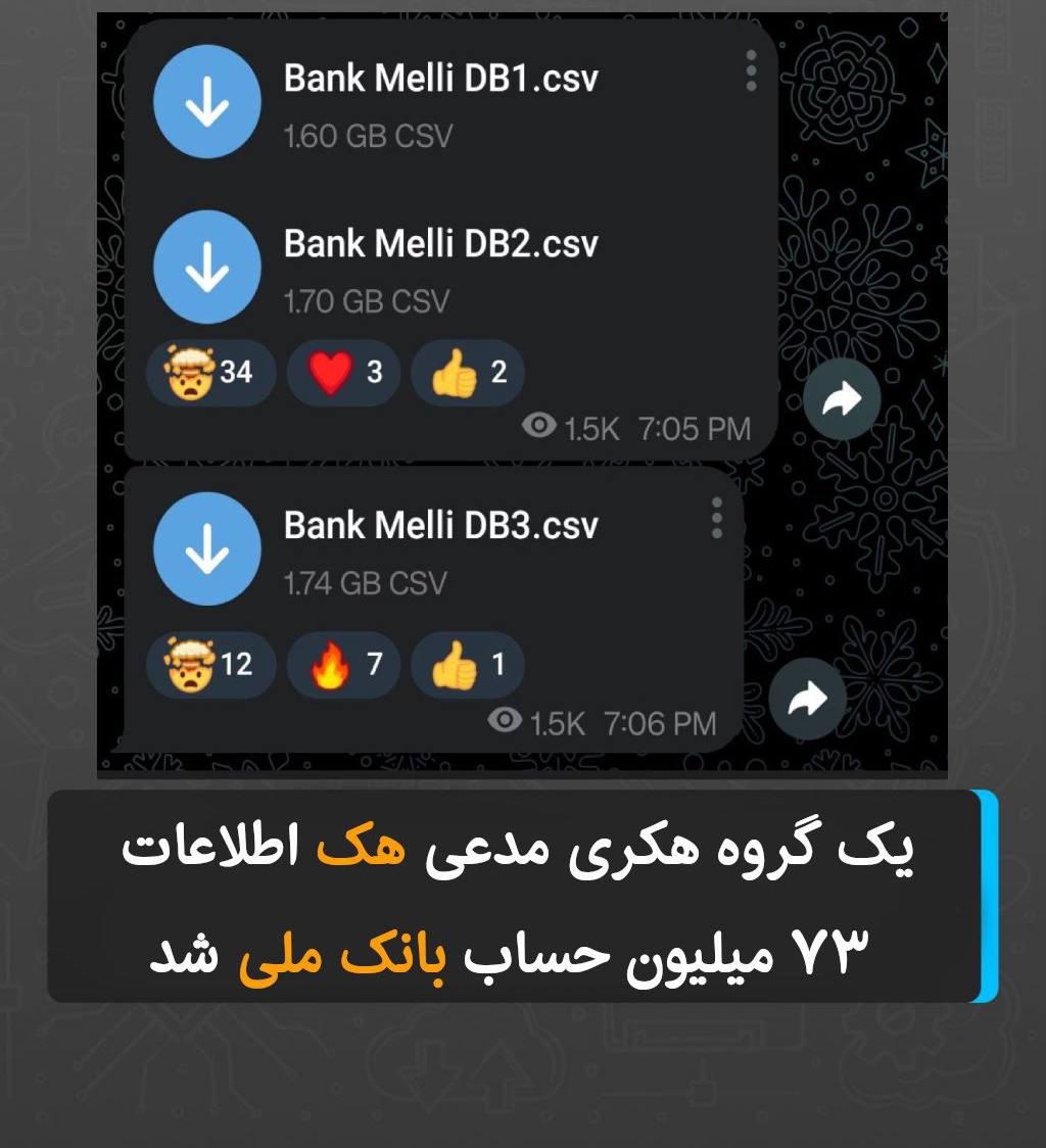گروه هکری تپندگان ادعا کرده دیتابیسهایی حاوی ۷۳ میلیون ردیف اطلاعات شامل کد ملی، شماره کارت بانکی، نام و نام خانوادگی، تاریخ تولد و شماره تلفن همراه منتشر کرده است. این گروه ادعا کرده که دادهها متعلق به مشتریان بانک ملی ایران هستند.