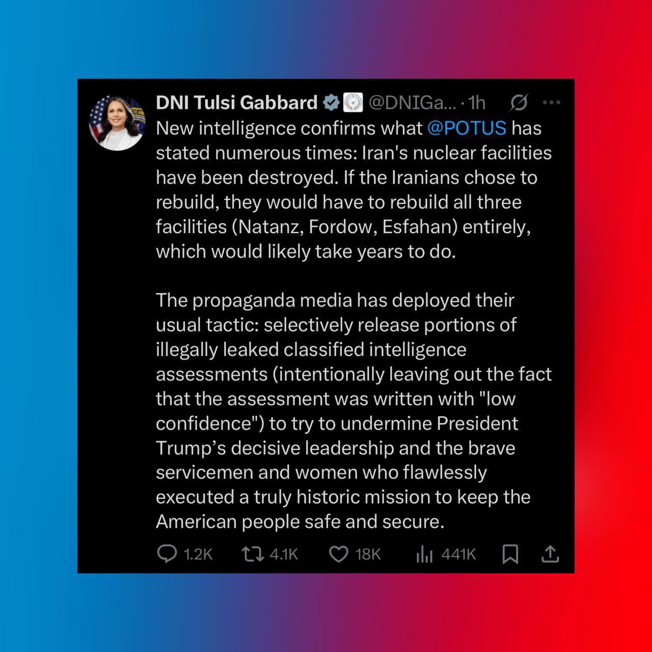 گابارد همچنین با انتقاد از رسانههای جریان اصلی در آمریکا گفت: «رسانههای تبلیغاتی با انتشار گزینشی بخشهایی از ارزیابیهای طبقهبندیشده و نادیده گرفتن عباراتی چون “اطمینان کم”، در تلاشند تا رهبری قاطع پرزیدنت ترامپ و عملیات دقیق نیروهای امنیتی آمریکا را زیر سؤال ببرند.»
