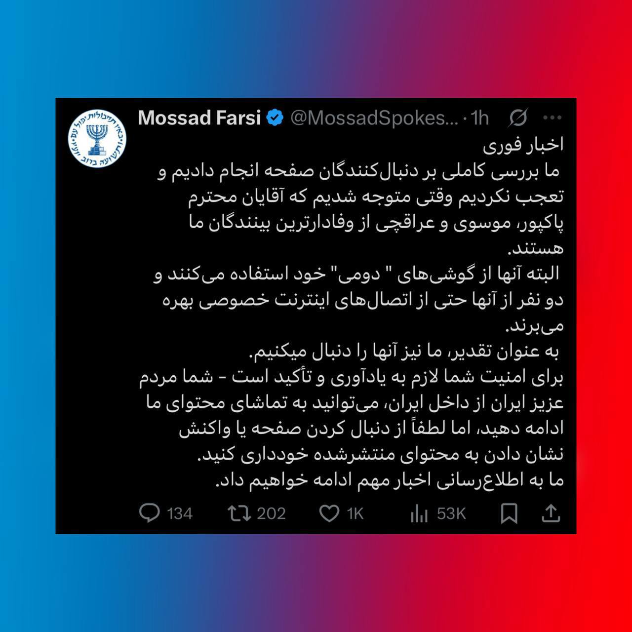 در افشاگریای تحقیرآمیز و بیسابقه، صفحه موساد فارسی با انتشار پیامی هشدارآمیز اعلام کرد که سه تن از چهرههای بلندپایه جمهوری اسلامی—سردار پاکپور، سید عباس موسوی و عباس عراقچی—از جمله «دنبالکنندگان وفادار» محتوای این سازمان اطلاعاتی اسرائیل هستند.