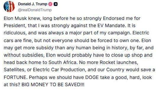 ایلان ماسک مدتها پیش از آنکه بهطور قاطع از من برای ریاستجمهوری حمایت کند، میدانست که من بهشدت با «الزام خودروهای برقی» مخالفم. این موضوع مسخره است و همیشه بخش مهمی از کارزار انتخاباتی من بوده است. خودروهای برقی خوباند، اما نباید همه مجبور باشند یکی از آنها را داشته باشند.