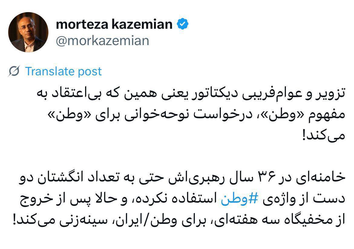 مرتضی کاظمیان: تزویر و عوامفریبی دیکتاتور یعنی همین که بیاعتقاد به مفهوم «وطن»، درخواست نوحهخوانی برای «وطن» میکند!