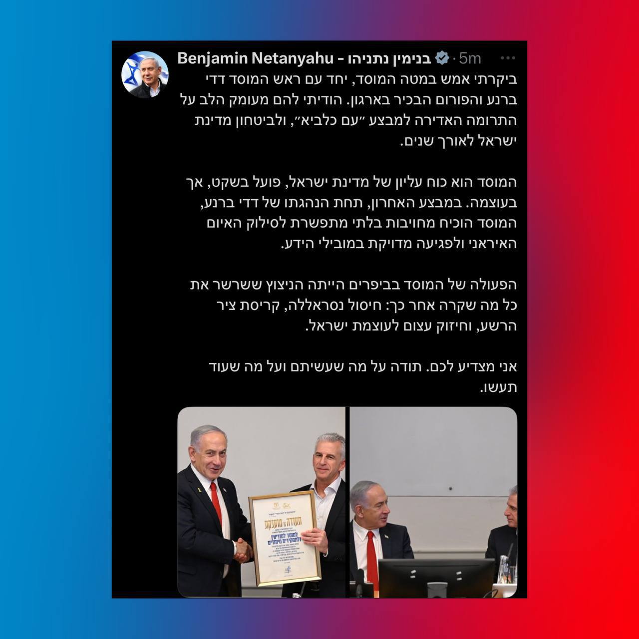 بنیامین نتانیاهو، نخستوزیر اسرائیل، در جریان بازدید از مقر موساد و دیدار با دیوید بارنیا، رئیس این نهاد اطلاعاتی، از نقش مؤثر این سازمان در مقابله با جمهوری اسلامی و بهویژه عملیات موسوم به «طلوع شیران» تقدیر کرد.