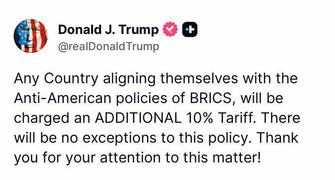 ترامپ: 🔸️هر کشوری که خود را با سیاستهای ضد آمریکایی بریکس همسو کند، مشمول 10٪ تعرفه اضافی خواهد شد. هیچ استثنایی برای این سیاست وجود نخواهد داشت. از توجه شما به این موضوع متشکریم! دیدگاهتان را بنویسید لغو پاسخدیدگاهبرای ارسال دیدگاه نام یا نامکاربری خود را وارد کنید برای ارسال دیدگاه آدرس ایمیل خود را وارد کنید آدرس وبسایت خود را وارد کنید (اختیاری) ذخیره نام، ایمیل و وبسایت من در مرورگر برای زمانی که دوباره دیدگاهی مینویسم. Δ