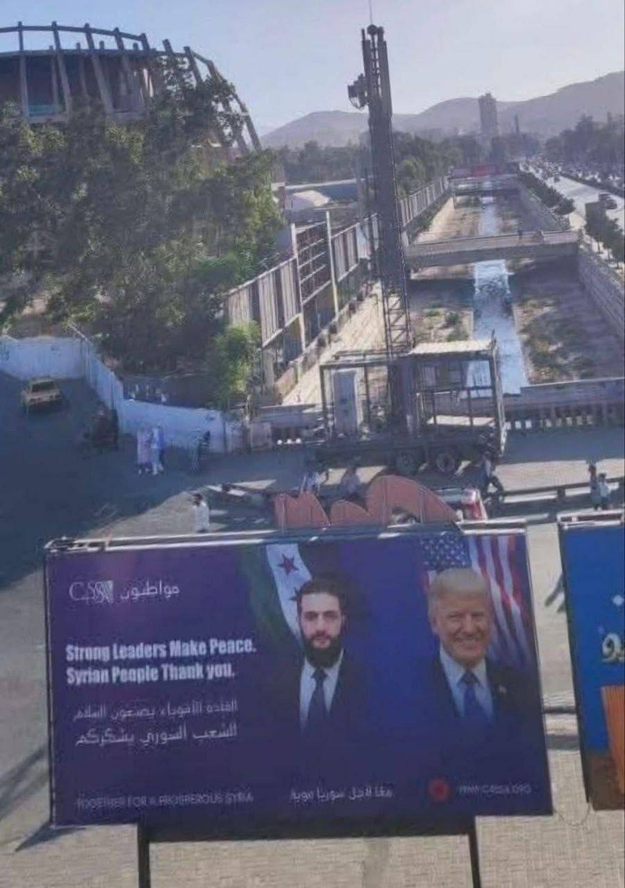 🔸️بیلبوردی در دمشق با تصاویری از احمد الشرع، رهبر سوریه، و ترامپ و پیامی به زبان انگلیسی: «رهبران قوی صلح را برقرار می‌کنند. مردم سوریه از شما متشکرند.»
