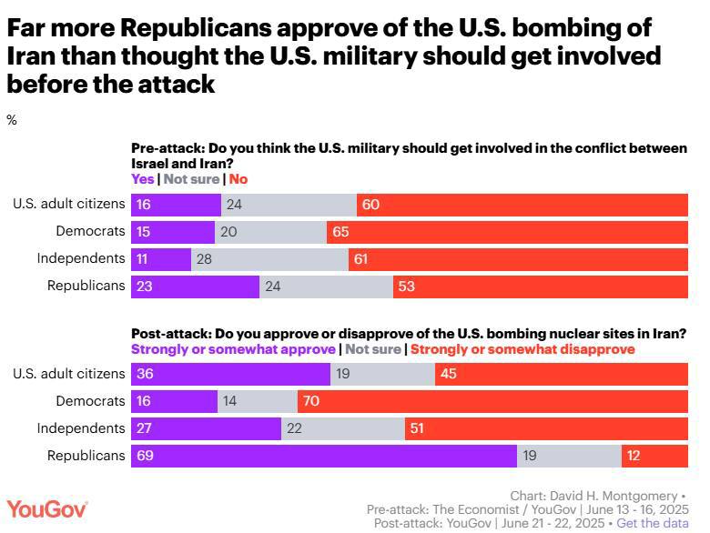 آنهایی که فکر می کنند ترامپ بخاطر افکار عمومی داخلی خودش حمله دیگری نخواهد کرد بهتر است این نظرسنجی را ببینند. در حالیکه قبل از حمله به ایران فقط ۲۳ درصد جمهوریخواهان و فقط ۱۶ درصد آمریکاییها موافق حمله آمریکا به ایران بودند، بعد از حمله این اعداد بنحو سرسامآوری افزایش یافته بطوری که ۶۹ درصد جمهوریخواهان و ۳۶ درصد مردم آمریکا حمله این کشور به ایران را مورد تایید قرار دادند! الان فقط ۱۲ درصد جمهوریخواهان کار ترامپ در حمله را رد میکنند درحالیکه قبل از حمله ۵۳ درصد جمهوریخواهان مخالف حمله بودند! باید واقعبینانه دید و در دام تحلیلهای غلط نیفتاد.