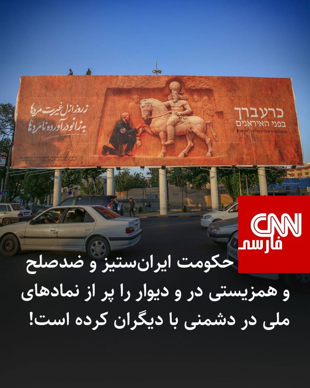 بر اساس گزارشهای میدانی در شهرهای مختلف، در و دیوارها پر از نمادهای ملی شده آنهم در حالی که برخلاف مفاهیم فرهنگی و ملی ایرانیان که بر صلح و همزیستی تأکید دارد، در این تبلیغاتِ شنیع و مبتنی بر ایدئولوژی اسلام سیاسی، رهبران اسرائیل و آمریکا در مقابل مجسمههای آرش، فریدون و شاپور زانو زدهاند!