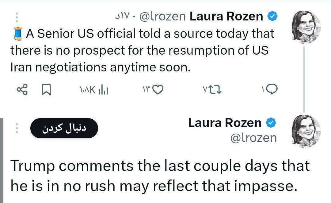 لارا روزن روزنامهنگار آمریکایی: یک مقام ارشد آمریکایی گفت که در حال حاضر هیچ چشماندازی برای ازسرگیری مذاکرات ایران و آمریکا در آینده نزدیک وجود ندارد.