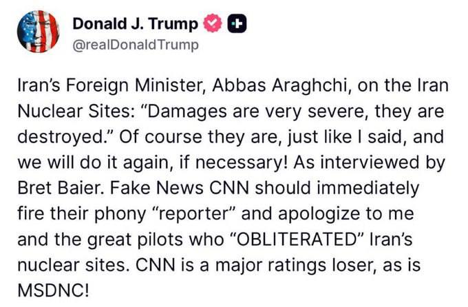 عباس عراقچی، وزیر امور خارجه ایران، در مورد سایتهای هستهای ایران: “خسارات بسیار شدید است، آنها نابود شدهاند.” البته که هستند، همانطور که گفتم، و اگر لازم باشد دوباره این کار را خواهیم کرد! همانطور که برت بایر در مصاحبهای گفت. سیانانِ اخبار جعلی باید فوراً “خبرنگار” قلابی خود را اخراج کند و از من و خلبانان بزرگی که سایتهای هستهای ایران را “نابود” کردند عذرخواهی کند. سیانان یک بازنده بزرگ رتبهبندی است، همانطور که اماسدیانسی هم همینطور!