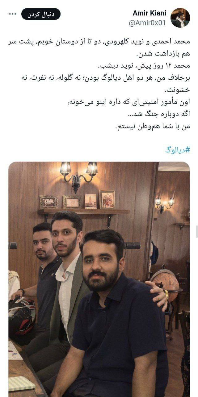 اینایی که این روزها دارن بازداشت میشن دیگه مخالفای جمهوری اسلامی نیستند، اینا طرفداران جمهوری اسلامی هستند که بعد از جنگ ۱۲ روزه از خامنهای انتقاد کردند. دیدگاهتان را بنویسید لغو پاسخدیدگاهبرای ارسال دیدگاه نام یا نامکاربری خود را وارد کنید برای ارسال دیدگاه آدرس ایمیل خود را وارد کنید آدرس وبسایت خود را وارد کنید (اختیاری) ذخیره نام، ایمیل و وبسایت من در مرورگر برای زمانی که دوباره دیدگاهی مینویسم. Δ