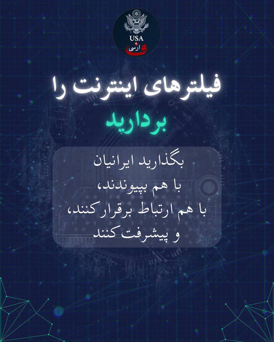 در این پیام که در حساب رسمی فارسی وزارت خارجه آمریکا در شبکههای اجتماعی ایکس منتشر شده، تأکید شده است که رژیم ایران با فیلترینگ اینترنت، آزادی بیان را سرکوب کرده و ارتباط مردم با جهان را قطع کرده است.
