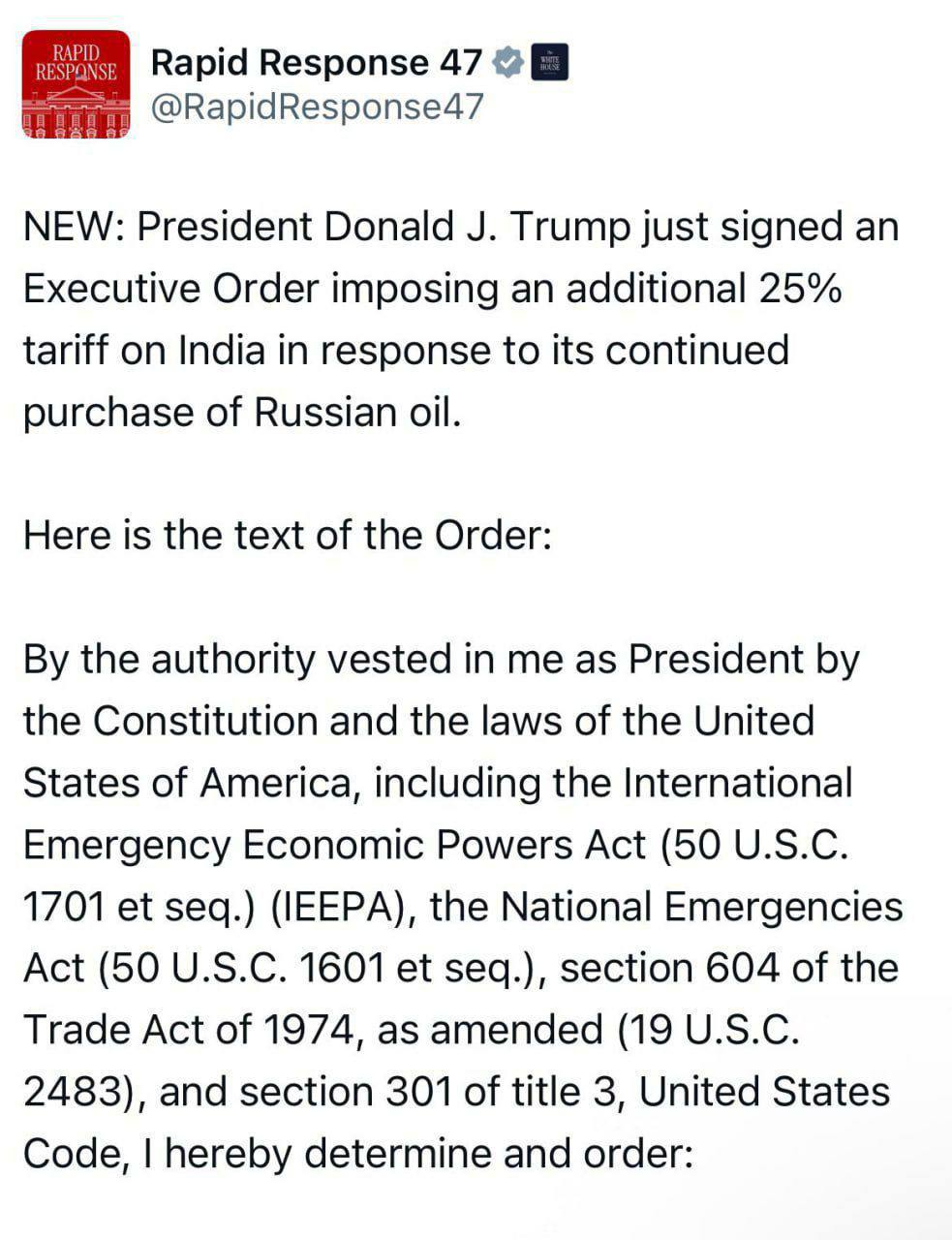 🔸️دونالد ترامپ، در واکنش به ادامه خرید نفت روسیه توسط هند، فرمان اجرایی وضع تعرفه ۲۵ درصدی اضافی بر واردات نفت هند علاوه بر تعرفه ۲۵ درصدی قبل را امضا کرد.
