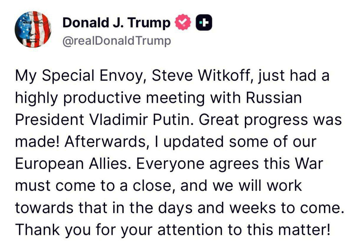 🔸️”فرستاده ویژه من، استیو ویتکاف، بهتازگی دیداری بسیار سازنده با رئیسجمهور روسیه، ولادیمیر پوتین، داشت. پیشرفت چشمگیری حاصل شد!