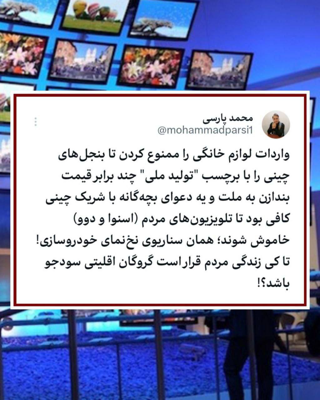 خامنه ای واردات لوازم خانگی را ممنوع کردن تا بنجلهای چینی را با برچسب “تولید ملی” چند برابر قیمت بندازن به ملت و یه دعوای بچهگانه با شریک چینی کافی بود تا تلویزیونهای مردم (اسنوا و دوو) خاموش شوند، همان سناریوی نخنمای خودروسازی!