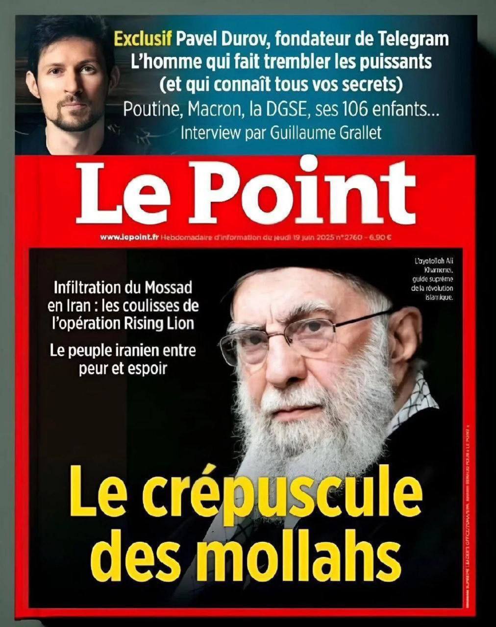 سقوط رژیم، دیگر پنهان نیست مجله فرانسوی با تیتر بزرگ «Le crépuscule des mollahs» بهمعنای «غروب ملایان»، تصویری از علی خامنهای را روی جلد خود منتشر کرده و نوشته است: «سقوط شما دیگر بر کسی پوشیده نیست… خامنهای، به پایان سلام کن.» در این گزارش ویژه، سردبیر مجله با اشاره به وضعیت بحرانی نظام ولایت فقیه، نوشته: «در حالیکه ایران در آتش نارضایتی اجتماعی، بحران اقتصادی، و انزجار جهانی میسوزد، رهبر این رژیم درمانده هنوز وانمود میکند که همهچیز تحت کنترل است؛ دروغی که حتی نزدیکترین مهرههایش هم دیگر باور ندارند.» این جلد، بازتاب گستردهای در رسانههای جهان داشته و بهعنوان یکی از صریحترین پیامهای رسانهای اروپایی علیه رژیم حاکم بر ایران شناخته میشود