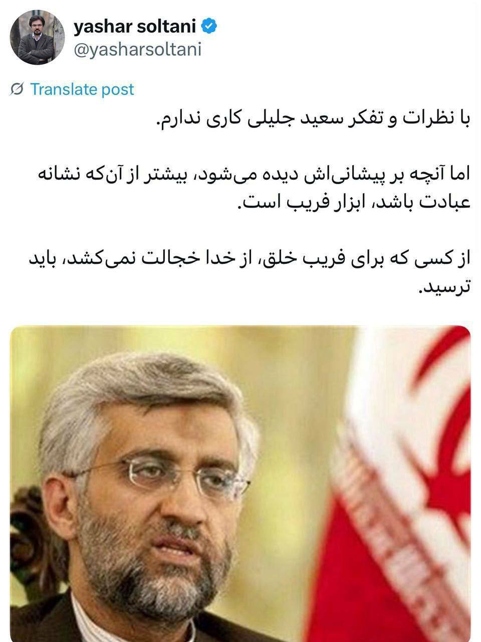 یاشار سلطانی:با نظرات و تفکر سعید جلیلی کاری ندارم. اما آنچه بر پیشانیاش دیده میشود، بیشتر از آنکه نشانه عبادت باشد، ابزار فریب است. از کسی که برای فریب خلق، از خدا خجالت نمیکشد، باید ترسید. دیدگاهتان را بنویسید لغو پاسخدیدگاهبرای ارسال دیدگاه نام یا نامکاربری خود را وارد کنید برای ارسال دیدگاه آدرس ایمیل خود را وارد کنید آدرس وبسایت خود را وارد کنید (اختیاری) ذخیره نام، ایمیل و وبسایت من در مرورگر برای زمانی که دوباره دیدگاهی مینویسم. Δ