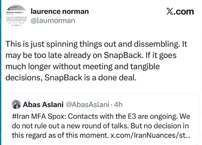 همزمان، عباس اصلانی بهنقل از سخنگوی وزارت خارجه جمهوری اسلامی گزارش داد که تماسها با سه کشور اروپایی (E3) ادامه دارد و «احتمال دور جدید گفتوگوها» رد نمیشود، اما «تا این لحظه تصمیمی در این باره گرفته نشده است.