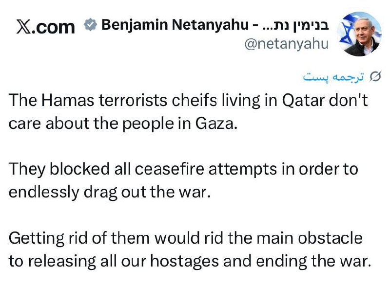 سران تروریستهای حماس که در قطر زندگی میکنند، به مردم غزه اهمیتی نمیدهند. آنها تمام تلاشها برای آتشبس را مسدود کردند تا جنگ را بیپایان ادامه دهند. خلاص شدن از آنها، مانع اصلی آزادسازی همه گروگانهای ما و پایان دادن به جنگ را برطرف میکند. دیدگاهتان را بنویسید لغو پاسخدیدگاهبرای ارسال دیدگاه نام یا نامکاربری خود را وارد کنید برای ارسال دیدگاه آدرس ایمیل خود را وارد کنید آدرس وبسایت خود را وارد کنید (اختیاری) ذخیره نام، ایمیل و وبسایت من در مرورگر برای زمانی که دوباره دیدگاهی مینویسم. Δ