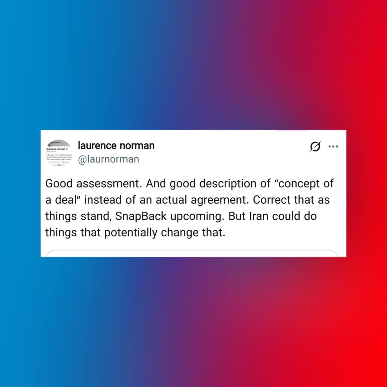 لارنس نورمن، خبرنگار وال استریت ژورنال، در پستی در شبکه اجتماعی ایکس اعلام کرد که با توجه به شرایط فعلی، مکانیسم اسنپبک (بازگشت خودکار تحریمهای سازمان ملل علیه جمهوری اسلامی) در حال نزدیک شدن است، اما رژیم ایران میتواند با انجام اقداماتی بالقوه این روند را تغییر دهد.