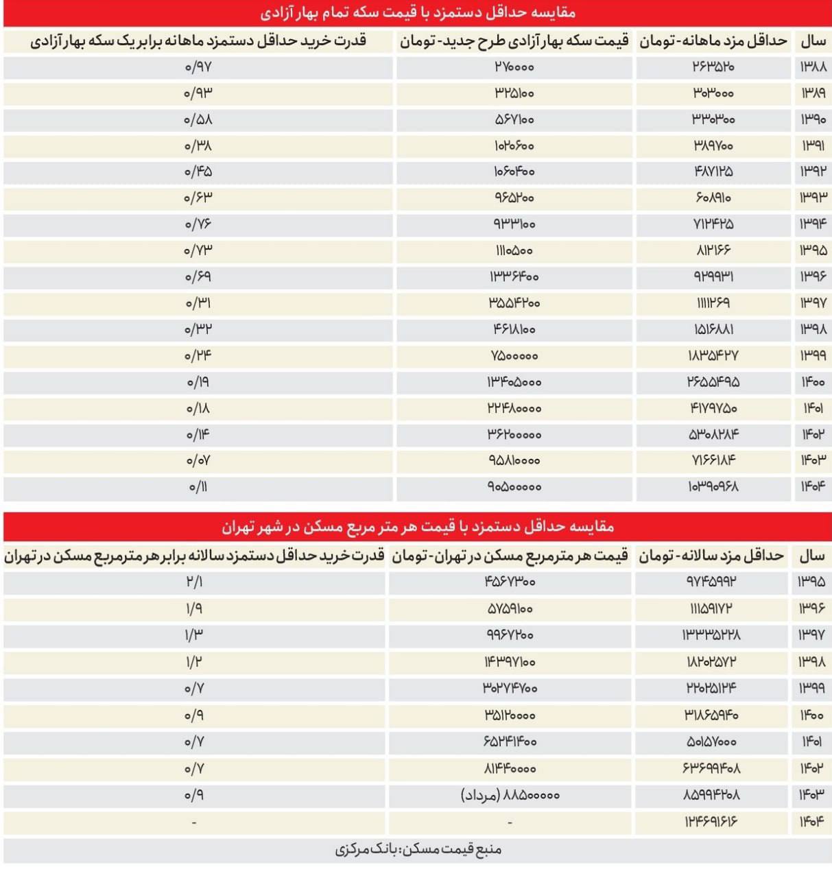 امروز یعنی در شهریور ۱۴۰۴ و دومین سال ریاستجمهوری پزشکیان که بیش از یک دهه فشارهای تحریم بر گرده اقتصاد وارد شده، با حداقل دستمزد در طول یک سال میتوان یک سکه تمام و یک ربع سکه خرید. یعنی توان خرید حداقل دستمزد در برابر سکه در طول ۱۶ سال ۸۹ درصد کمتر شده است.