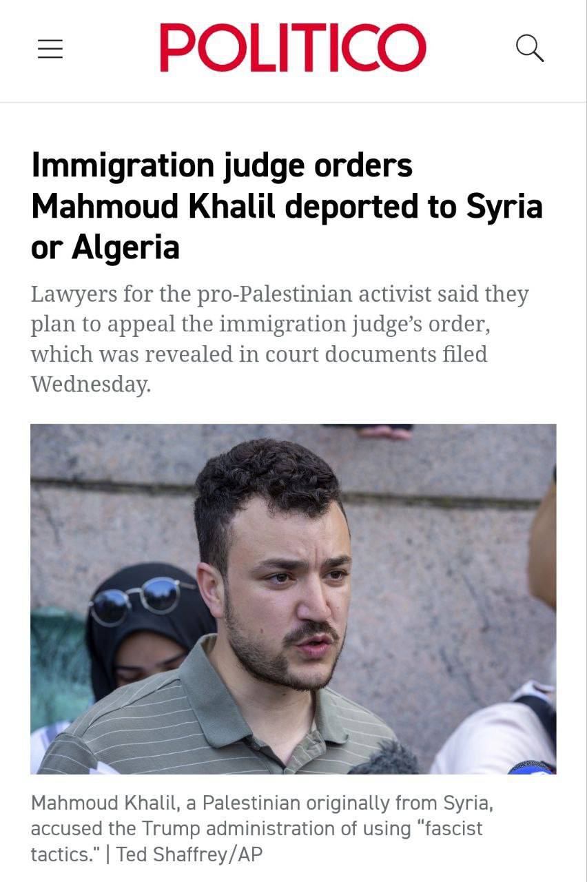 دادگاهی فدرال در آمریکا حکم اخراج محمود خلیل، فعال دانشجویی فلسطینی دانشگاه کلمبیا، به الجزایر یا سوریه را صادر کرد. اتهام او پنهانکردن اطلاعات در درخواست برای گرینکارت عنوان شده است.
