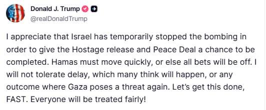 قدردانی میکنم که اسرائیل موقتا بمباران را متوقف کرده تا به آزادی گروگانها و اجرای توافق صلح فرصت داده شود. حماس باید سریع حرکت کند، وگرنه همهچیز بههم میریزد. من تأخیر—که بسیاری گمان میکنند رخ خواهد داد—را تحمل نخواهم کرد، و هیچ نتیجهای را که در آن غزه دوباره تهدیدی ایجاد کند قبول نمیکنم. بیایید این کار را سریع انجام دهیم. با همه منصفانه برخورد خواهد شد!