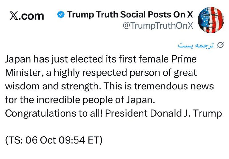 ژاپن اولین نخستوزیر زن خود را انتخاب کرد، شخصی بسیار محترم با حکمت و قدرت فراوان. این خبر فوقالعادهای برای مردم شگفتانگیز ژاپن است. به همه تبریک میگویم! رئیسجمهور دونالد ج. ترامپ