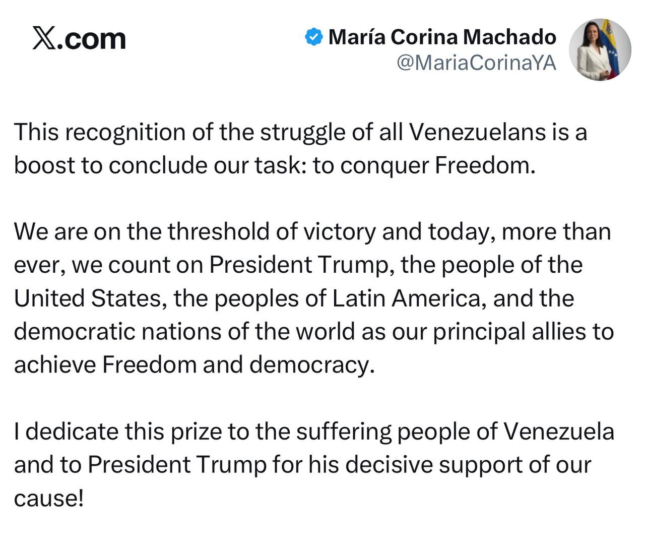 🔺️من این جایزه را به مردم رنجدیده ونزوئلا و به رئیسجمهور ترامپ به خاطر حمایت قاطعش از آرمان ما تقدیم میکنم!