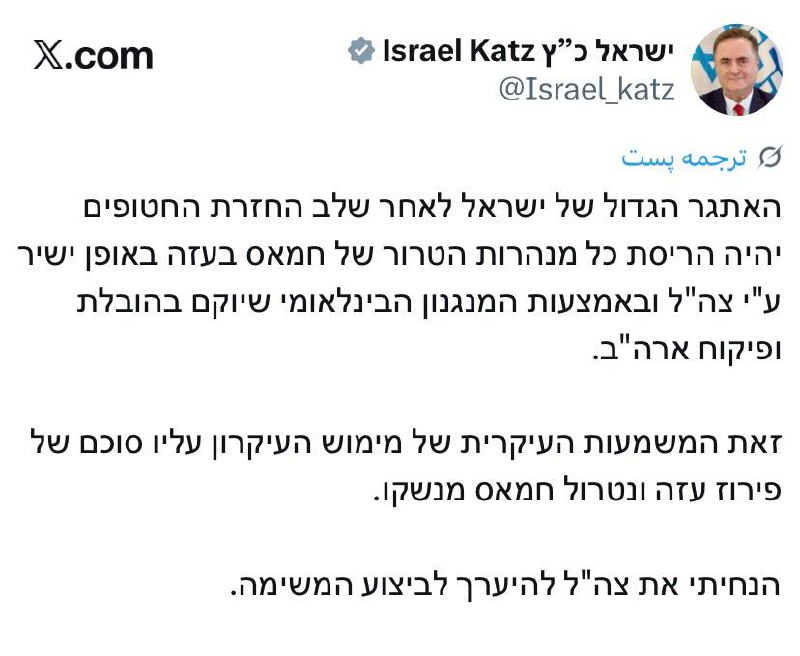 چالش بزرگ اسرائیل پس از مرحله بازگرداندن گروگانها، تخریب تمامی تونلهای تروریستی حماس در غزه به صورت مستقیم توسط ارتش اسرائیل و از طریق مکانیزم بینالمللی که تحت رهبری و نظارت ایالات متحده ایجاد خواهد شد، خواهد بود.