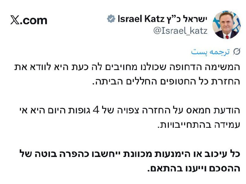 اعلام حماس درباره بازگرداندن احتمالی ۴ جسد امروز، عدم پایبندی به تعهدات است.