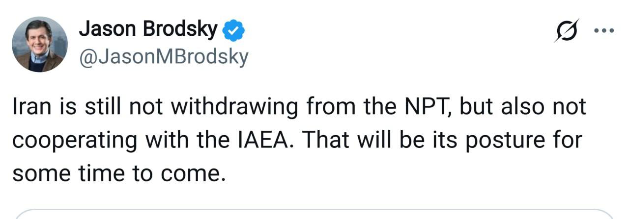 «اگرچه (رژیم) ایران هنوز عضو انپیتی است، اما رفتار فعلیاش نشان میدهد که عملاً از تعهدات خود فاصله گرفته و همکاری با آژانس را متوقف کرده است. به نظر میرسد این وضعیت برای مدتی ادامه پیدا کند.»