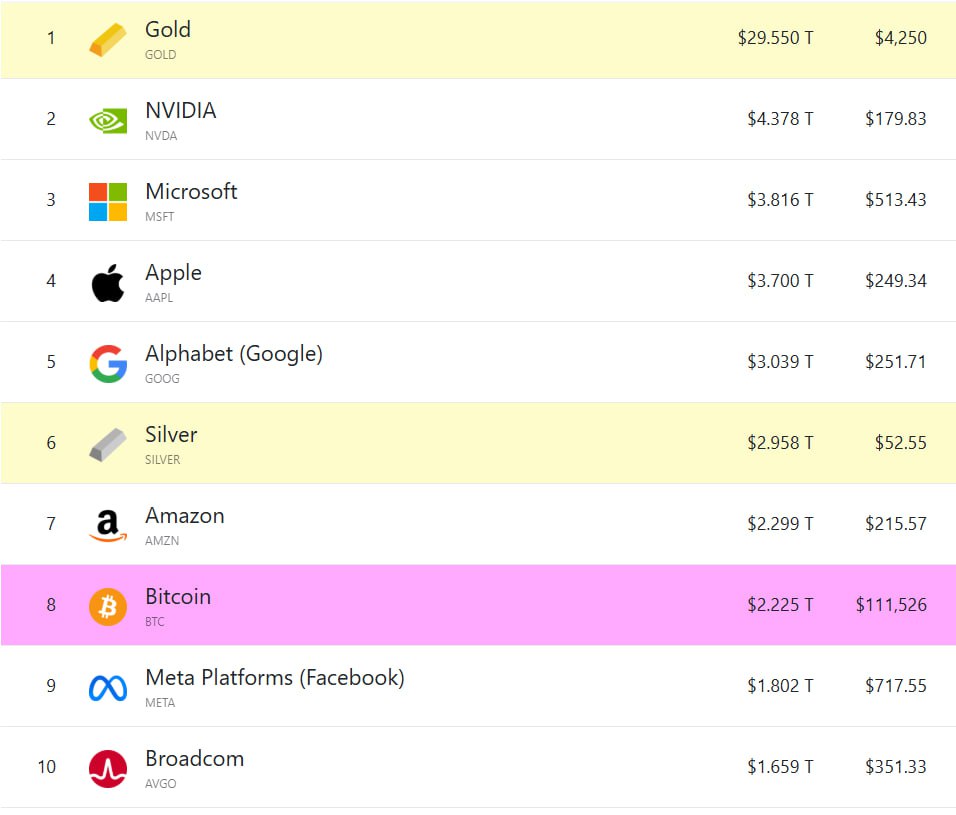 🔹در جدول بالا 10 دارایی با بالاترین ارزش بازار معرفی شده اند. پس از طلا، شرکت انویدیا قرار دارد. رونق فناوری پیشرفته به رشد قیمت سهام شرکت های فعال در این حوزه منجر شده و ارزش بازار آنها بالا رفته است. در این فهرست نقره و بیتکوین به ترتیب در جایگاه های ششم و هشتم قرار دارند.