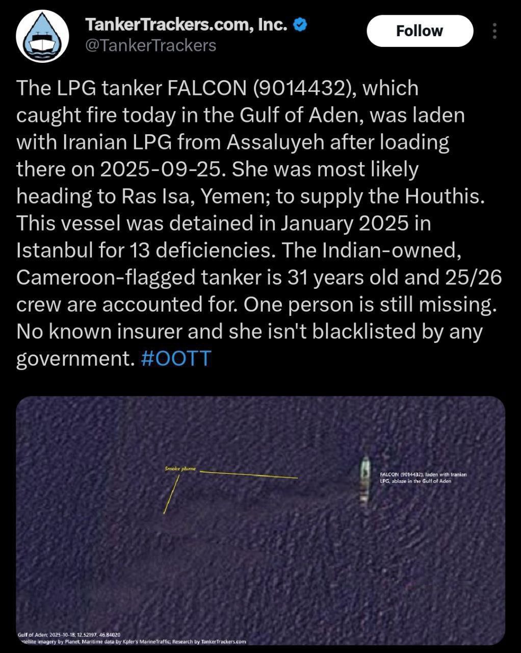 🔹تصویر نشان میدهد که یک کشتی به نام FALCON که حامل گاز مایع پروپان ایرانی بوده، در خلیج عدن دچار آتشسوزی شده است