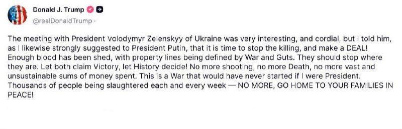 🔺دیگر نه تیراندازی، نه مرگ، نه هزینههای هنگفت و بیپایان. این جنگی است که اگر من رئیسجمهور بودم هرگز آغاز نمیشد. هر هفته هزاران نفر قربانی میشوند — بس است؛ به خانهها و کنار خانوادههایتان بازگردید