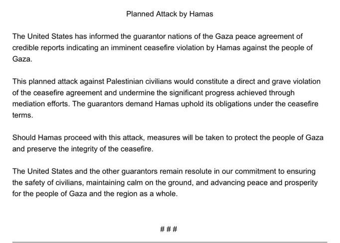 ایالات متحده، کشورهای ضامن توافق صلح غزه را از گزارشهای موثق دربارهی نقض قریبالوقوع آتشبس از سوی حماس علیه مردم غزه آگاه کرده است.