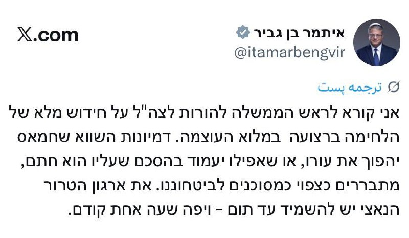 من از نخستوزیر میخواهم که به ارتش اسرائیل دستور دهد تا عملیات نظامی در نوار غزه را با تمام قدرت از سر بگیرد. این توهمات بیاساسی که حماس تغییر ماهیت خواهد داد یا حتی به توافقی که امضا کرده پایبند خواهد ماند، همانطور که انتظار میرفت، برای امنیت ما خطرناک است. سازمان تروریستی نازی باید کاملاً نابود شود – و هرچه زودتر بهتر.