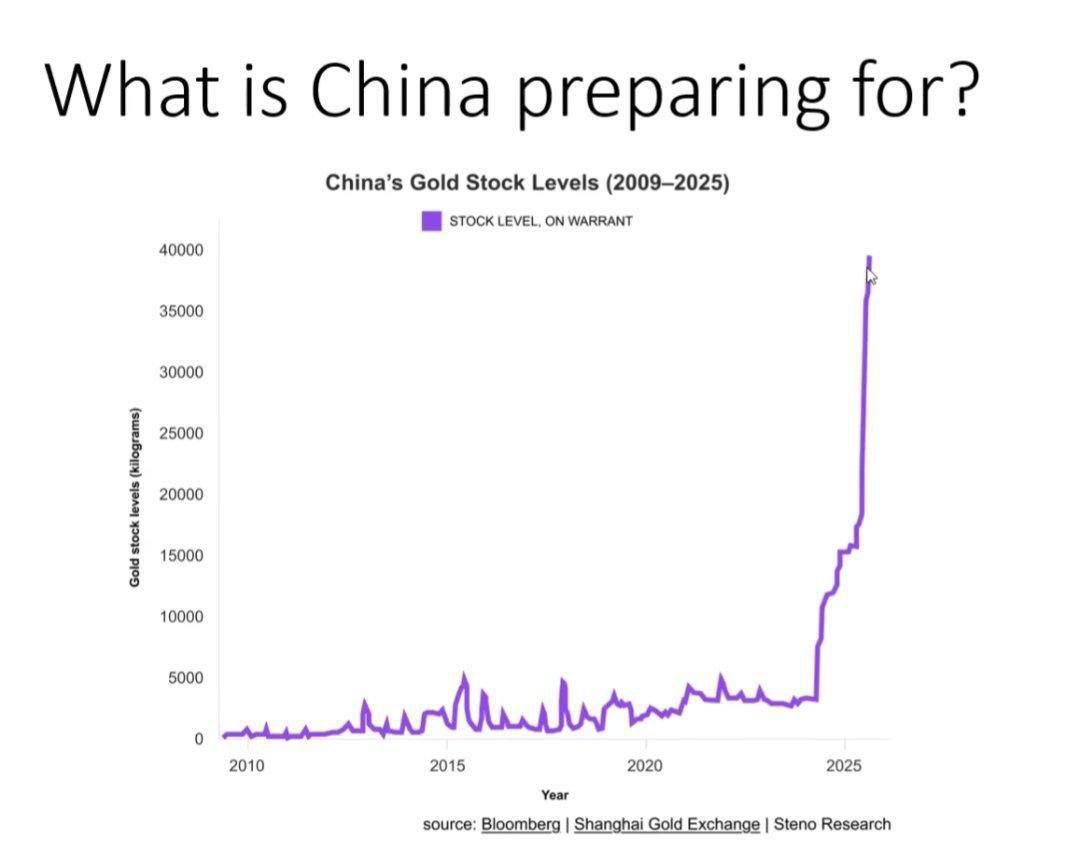 🔴موجودی طلای چین که تحت ضمانت رسمی نگهداری میشود — یعنی طلای فیزیکی قابل معاملهای که در خزانههای رسمی شانگهای نگهداری میشود — به بالاترین سطح تاریخی خود رسیده است.