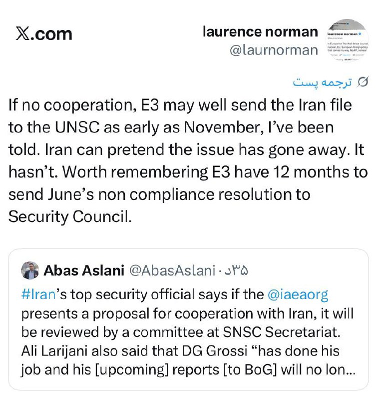 اگر همکاری صورت نگیرد، گفته شده که کشورهای اروپایی (E3) ممکن است پرونده ایران را همین نوامبر به شورای امنیت سازمان ملل بفرستند. ایران ممکن است وانمود کند که مشکل حل شده، اما اینطور نیست.