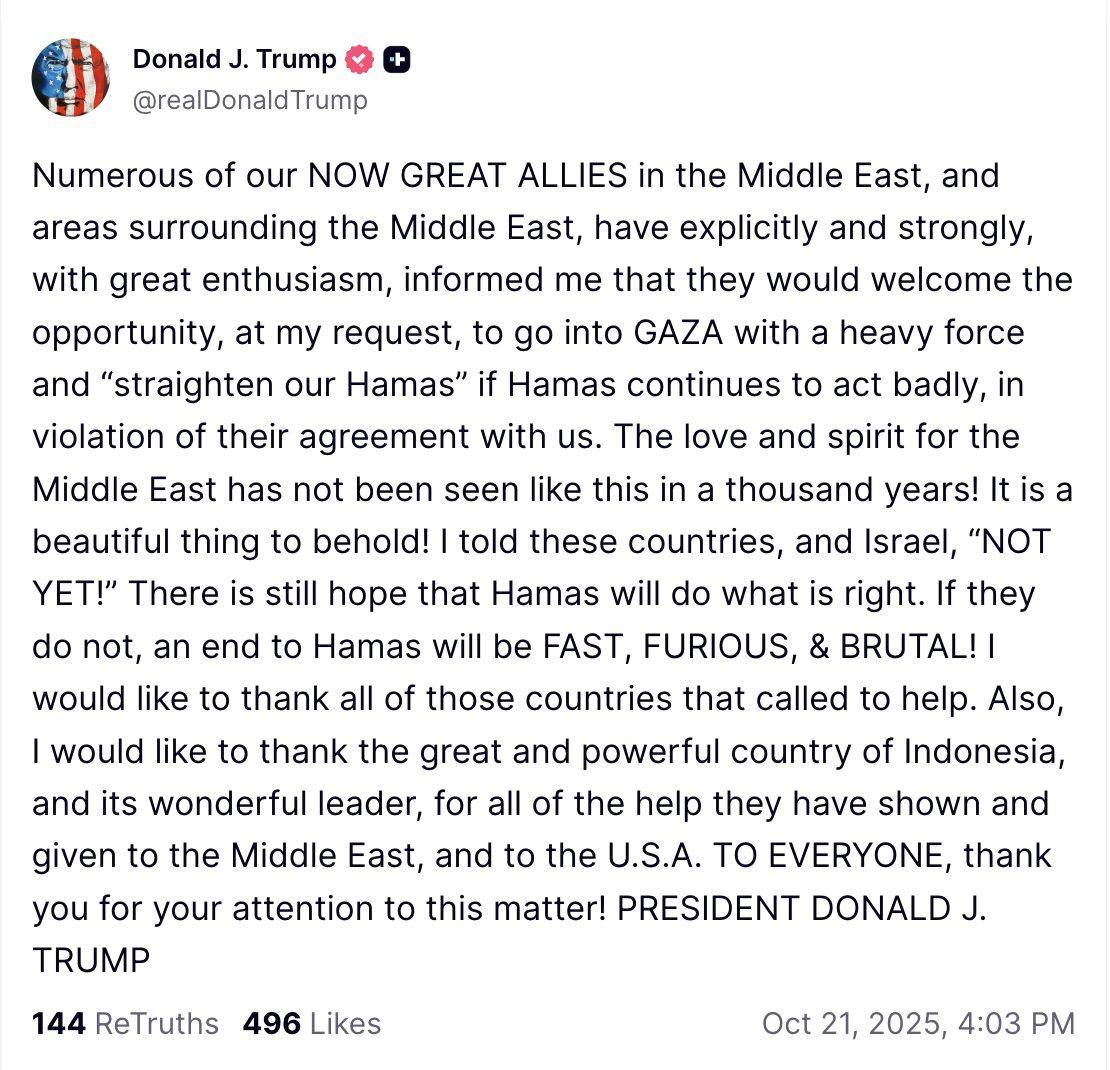 بسیاری از همپیمانان بزرگ کنونی ما در خاورمیانه و مناطق پیرامون آن، بهصراحت، با قدرت و شور فراوان به من اطلاع دادهاند که در صورت درخواست من، از این فرصت استقبال میکنند تا با نیرویی سنگین وارد غزه شوند و «حماس را سر جای خود بنشانند»، اگر این گروه به رفتار نادرست خود و نقض توافقش با ما ادامه دهد.