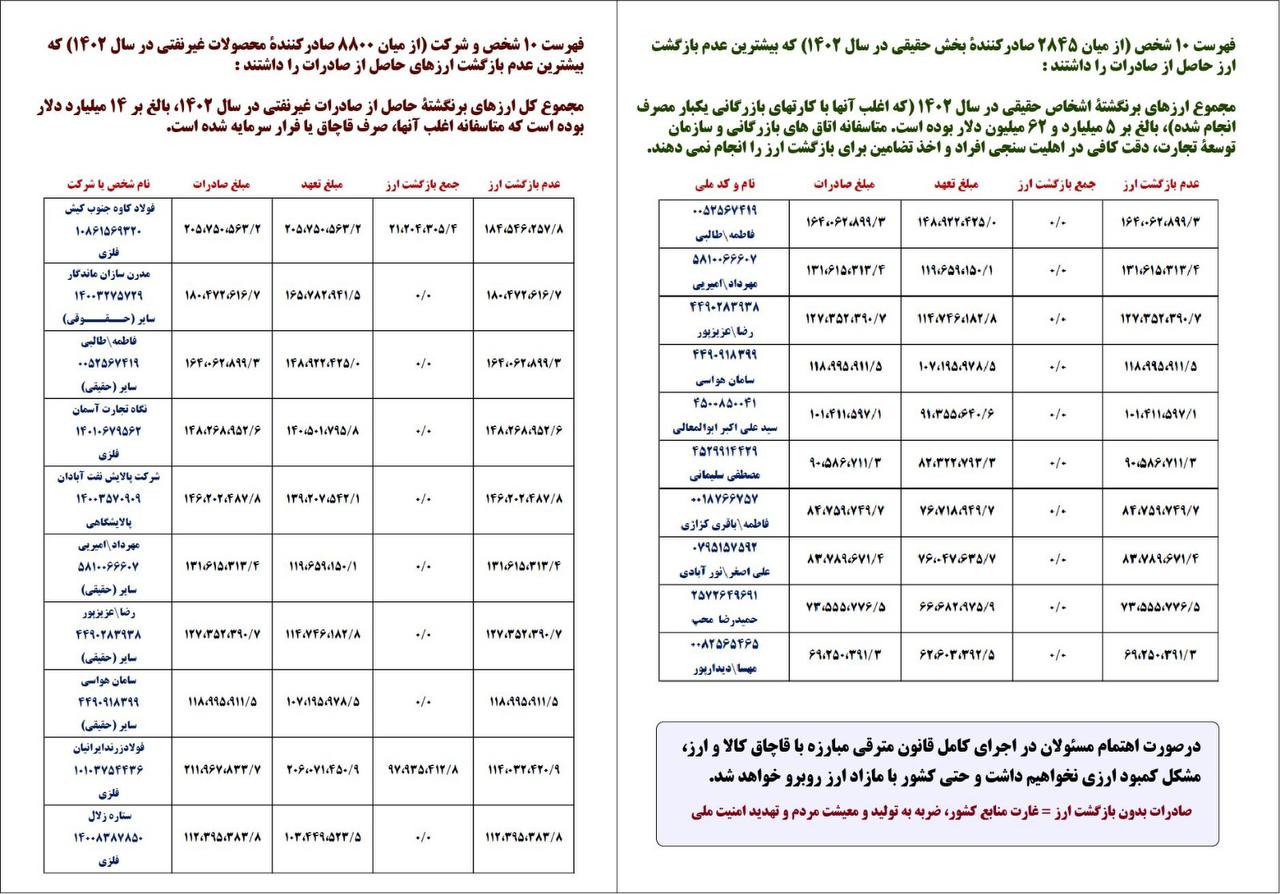 🔺او اعلام کرد: در مرحله نخست، فهرست ۱۰ شخص حقیقی و ۱۰ شرکت با بیشترین بدهی ناشی از عدم بازگشت ارز در سال ۱۴۰۲ منتشر خواهد شد. به گفته صمصامی، تمام اطلاعات متخلفان از سال ۹۷ تا چهار ماهه نخست ۱۴۰۴ در دسترس است و اسامی آنها به مرور منتشر میشود.
